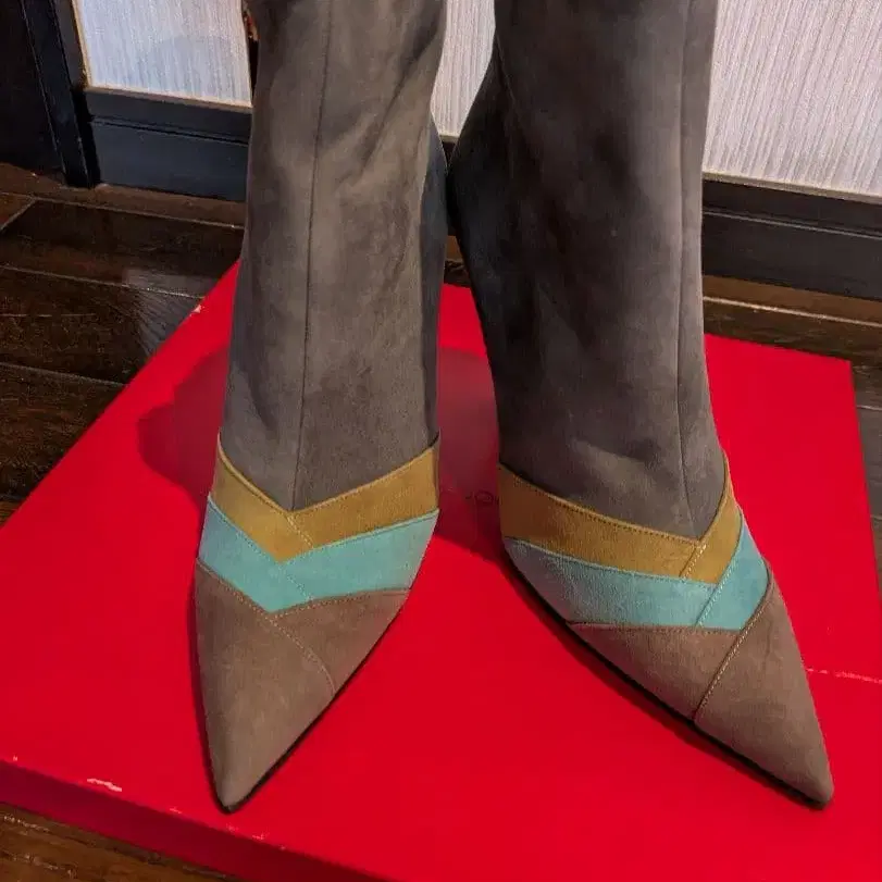 올겨울 추운 시즌에 딱 맞는 미니 부츠입니다. 그레이 스웨이드 소가죽 소재에 컬러풀한 스트라이프 디자인의 하이힐 부츠로 발끝부터 멋스럽게 연출해보세요. 그레이, 파랑, 노랑, 그린 스트라이프 뒷면은 골드 컬러 원단 - 굽 높이: 하이힐 - 지퍼: 사이드 지퍼 부착 [ 사이즈 ] 38 사이즈 24cm~24.5cm 발등 부분이 약간 좁게 제작되었습니다. 23.5cm에서 24cm 정도인 분이 맞을지도 모릅니다. 어디까지나 참고용입니다. [ 굽 높이 ] 9.5cm 플랫폼 2.5cm [ 신발 길이 ] 미들