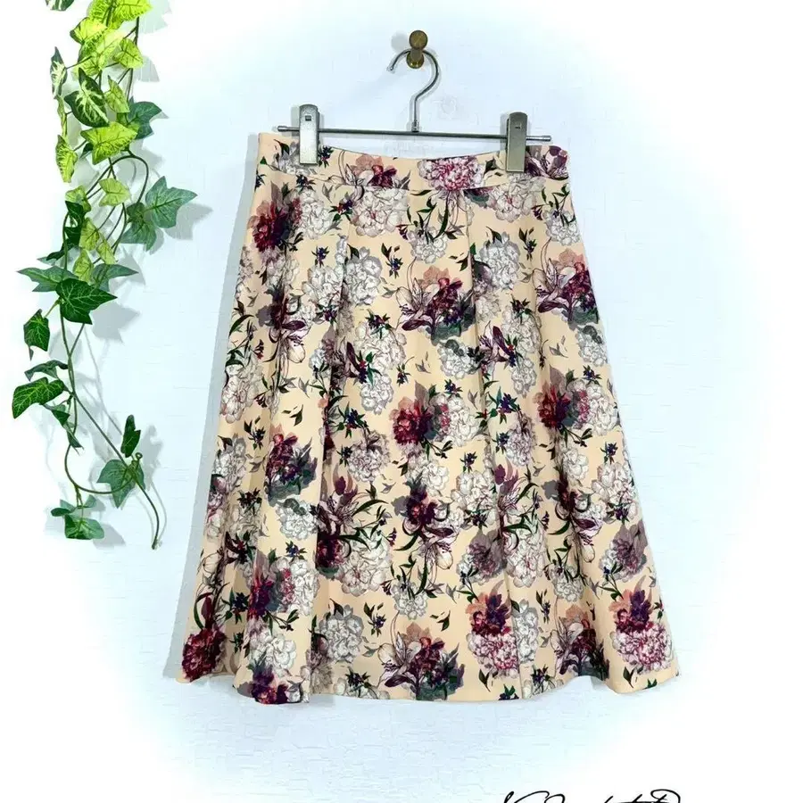 Reflect (리플렉트)의 화려한 꽃무늬 플레어 스커트입니다. 부드러운 베이지(스킨 컬러)에 퍼플이나 화이트 계열의 플라워 모티브가 고급스럽고 성숙/러블리한 분위기를 연출합니다. 풍성한 플레어 실루엣이 여성스러움을 돋보이게 하며, 출퇴근 오피스 스타일부터 평소 사용까지 폭넓게 활약합니다. 안감이 부착되어 안심감이 있으며, 눈에 띄는 얼룩이나 보풀이 없는 새상품급입니다.