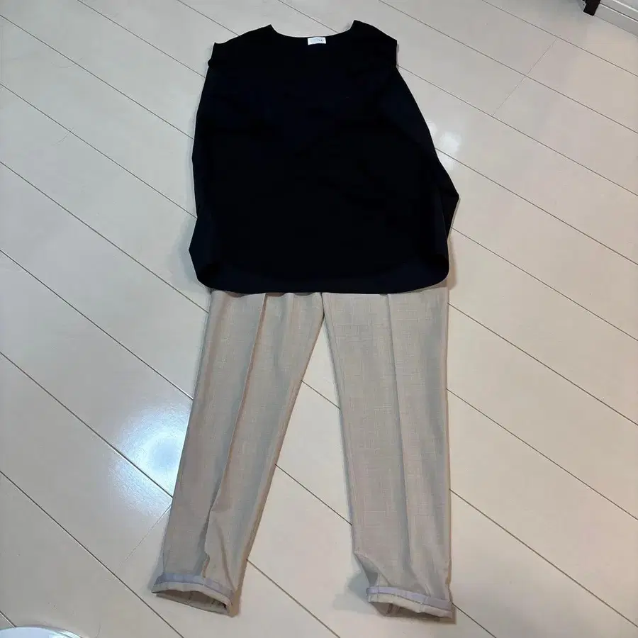 블랙 긴팔 상의와 베이지 팬츠 세트