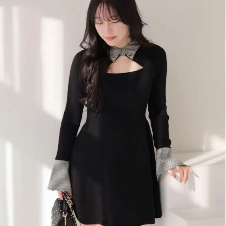 립 서비스 체크 자카드 앙상블 니트 원피스 화이트