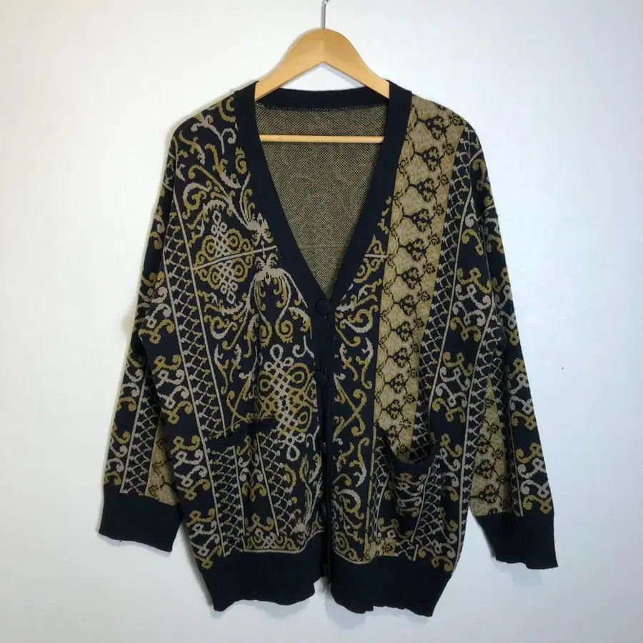 자동 번역되었어요. 원문보기기하학 패턴의 네이비와 골드 색상 가디건, 포켓 부착.