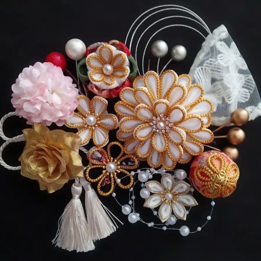 수많은 상품 중에서 방문해 주셔서 감사합니다. m(_ _)m 다양한 크레이프 원단 꽃 모티브와 태슬이 특징인 핸드메이드 머리 장식. - 색상: 골드, 화이트, 빨검, 핑크 - 소재: 니코시 크레이프 원단, 비즈 - 디자인: 크레이프 원단 꽃 모티브, 태슬, 레이스 - 용도: 머리 장식, 일본 정통 의상 소품 - 특징: 핸드메이드 메인 꽃은 직경 약 7cm입니다. 모두 각각 1개씩 U핀으로 마감되어 있어 자유롭게 어레인지하여 사용하실 수 있습니다. 성인식, 결혼식, 졸업식, 입학식, 혼인 등 경사스러운 날의 기모노에 추천합니다. 핸드메이드이므로 풀칠 자국이나 꽃의 왜곡 등이 있습니다. 이해해 주시는 분의 구매 부탁드립니다. m(_ _)m ★ 원활하고 기분 좋은 거래를 위해 반드시 프로필을 일독해 주시기 바랍니다.