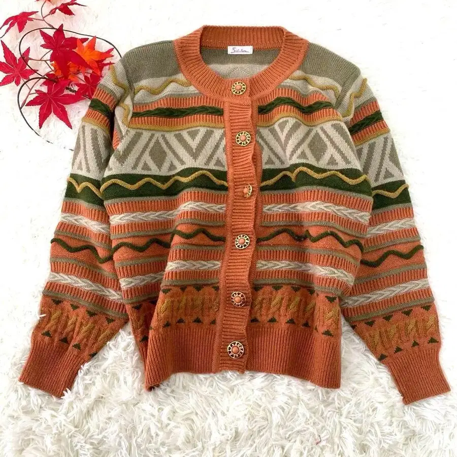 기하학 패턴의 오렌지 계열 가디건, 장식 버튼 포함입니다 ✨ 어깨 패드 내장!