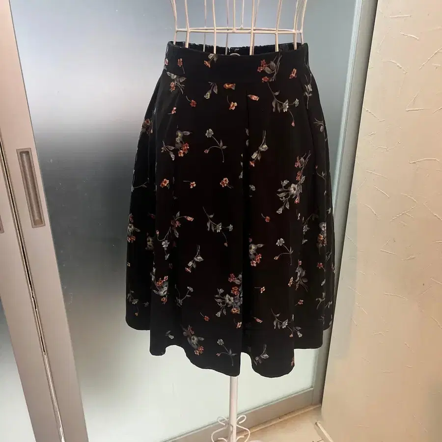 자동 번역되었어요. 원문보기블랙 베이스에 꽃무늬 플레어 스커트, 무릎 기장으로 여성스러운 실루엣.