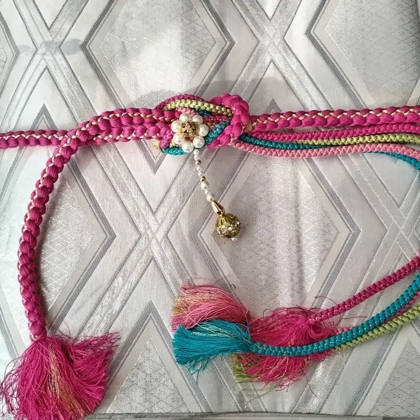 색상이 선명한 뜨개질 디자인의 허리띠, 펄과 방울 장식이 특징입니다. - 색상: 핑크, 파랑, 그린 - 디자인: 뜨개질, 술 장식 - 소재: 패브릭 소재 - 장식: 펄, 방울 포함 방문해 주셔서 감사합니다.
