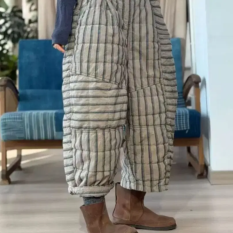 스트라이프 퀼팅 와이드 면 팬츠