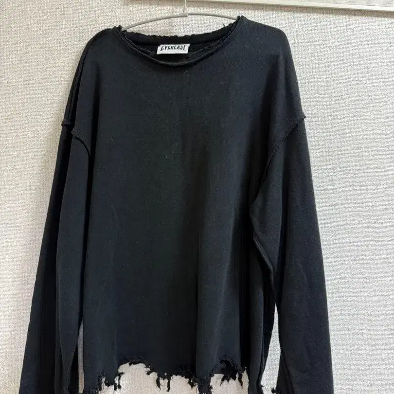 소매와 밑단뿐만 아니라 넥라인에 풍부하게 들어간 데미지 가공이 포인트입니다.