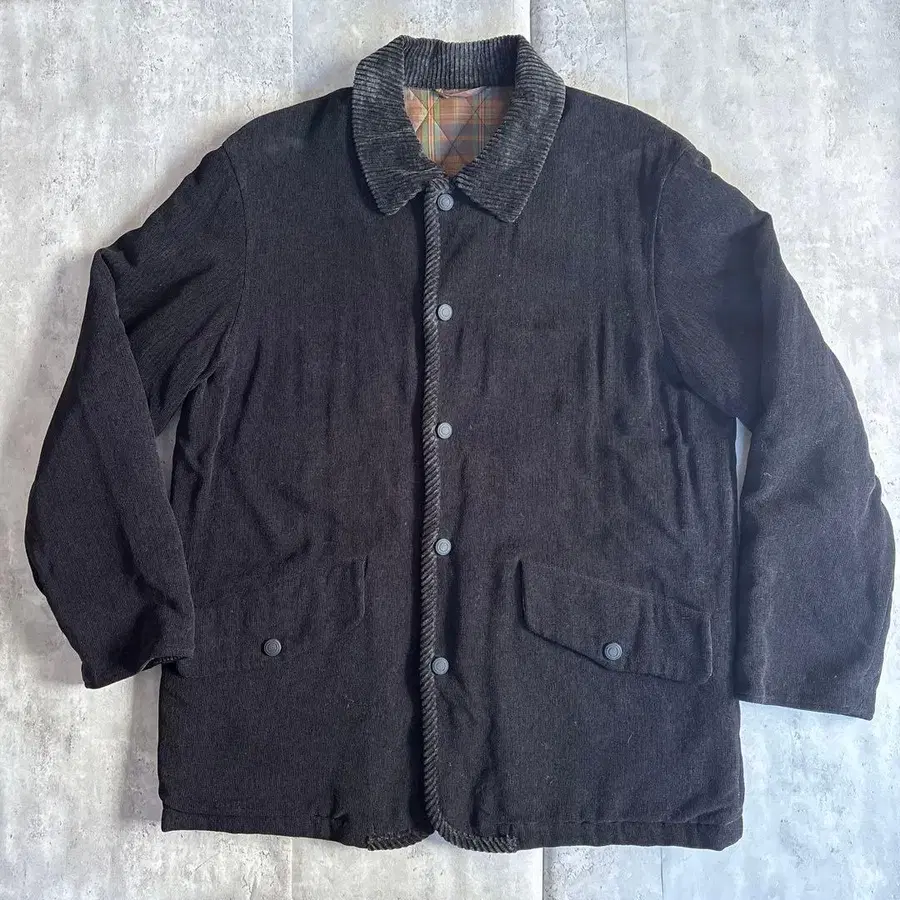 옷깃과 플라켓, 밑단 부분에는 **코듀로이 소재 (면 100%)**를 사용하여, 은은한 이소재 절개가 디자인의 악센트가 됩니다.
