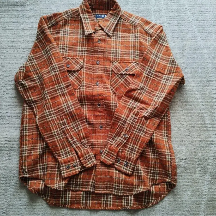 UNIQLO 네이비 택 오렌지 계열 체크 무늬 플란넬 셔츠 M
