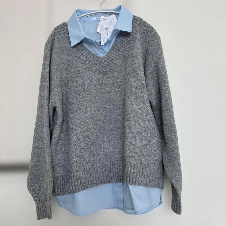 그레이 V넥 스웨터 스카이블루 셔츠 포함 M