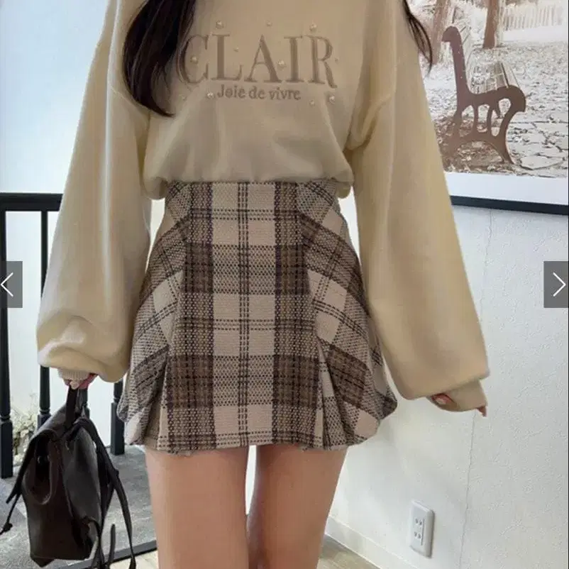 베이지 계열 미니 스커트 인빵 안감 부착 체크 무늬 플리츠 스커트