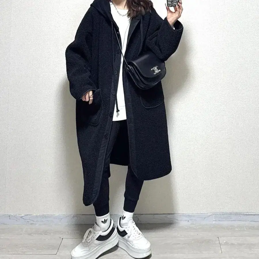 보아, 무스탕 라이크 맨투맨 후디 long 코트 블랙