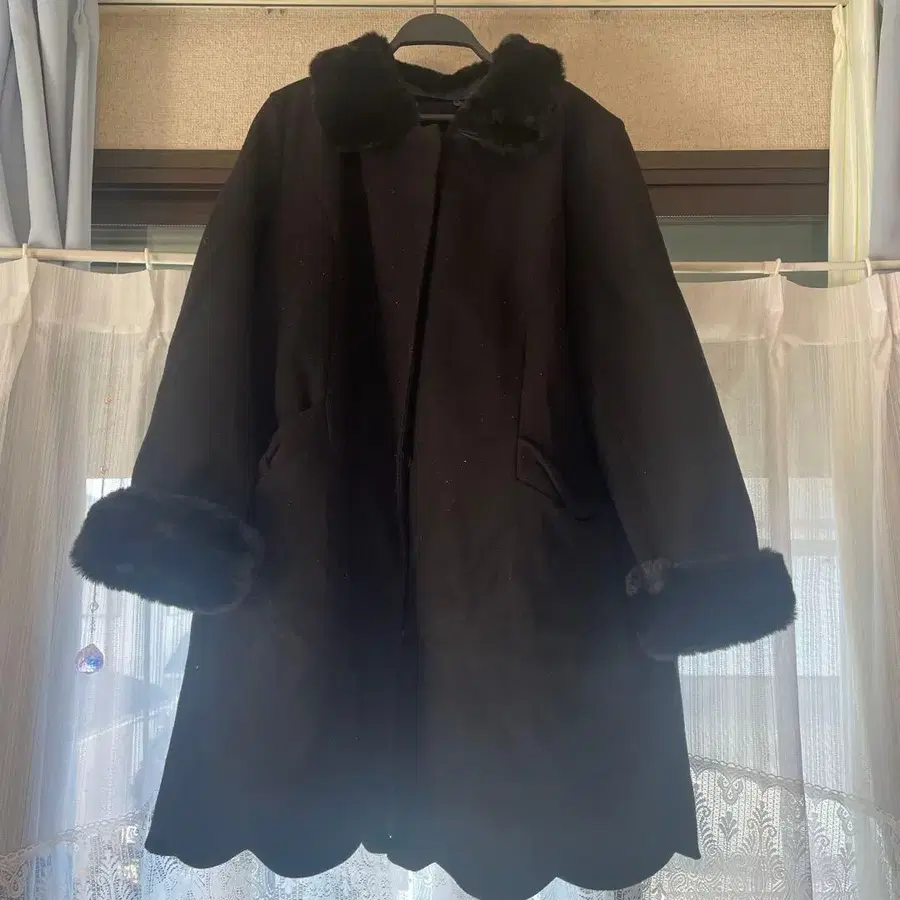 밑단 스캘럽 블랙 퍼 부착 롱 코트 3L