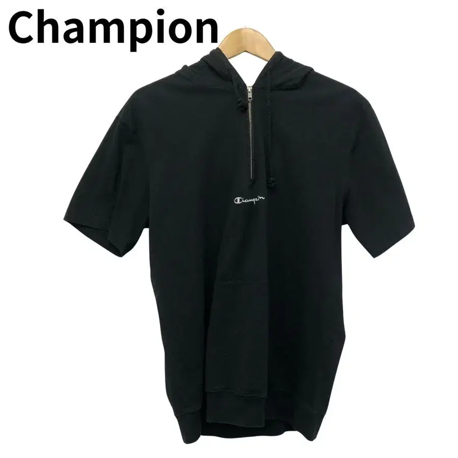 Champion 블랙 숏 슬리브 후디 하프 지퍼 후드 끈 포함 XL 사이즈 로고 자수 로고 와펜 앞 포켓 포함 면 100% 캐주얼 심플 돌려입기 다용도 모노톤 코디 인기 브랜드