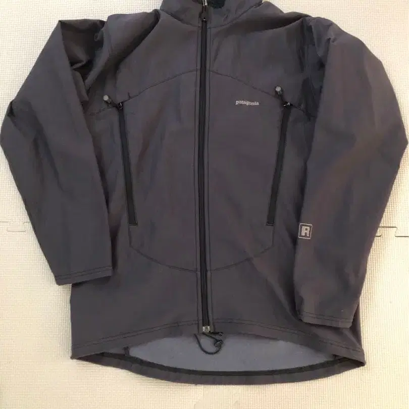 그레이 색상의 풀 집업 점퍼, 포켓이 달린 patagonia 제품.