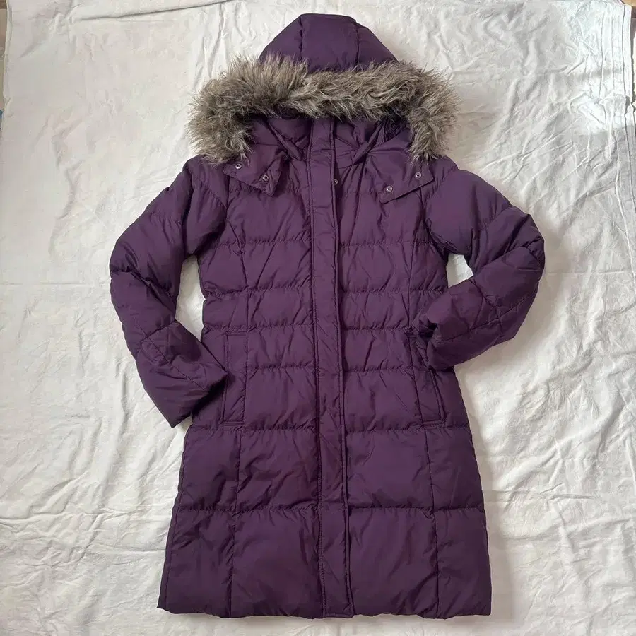 유니클로 프리미엄 다운 보라색 후드 부착 롱 기장 다운 자켓