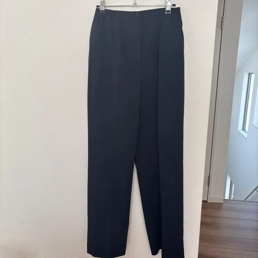 자동 번역되었어요. 원문보기스트레이트 스타일의 네이비 슬랙스, 허리는 밴딩과 버튼 조합으로 쾌적한 착용감.