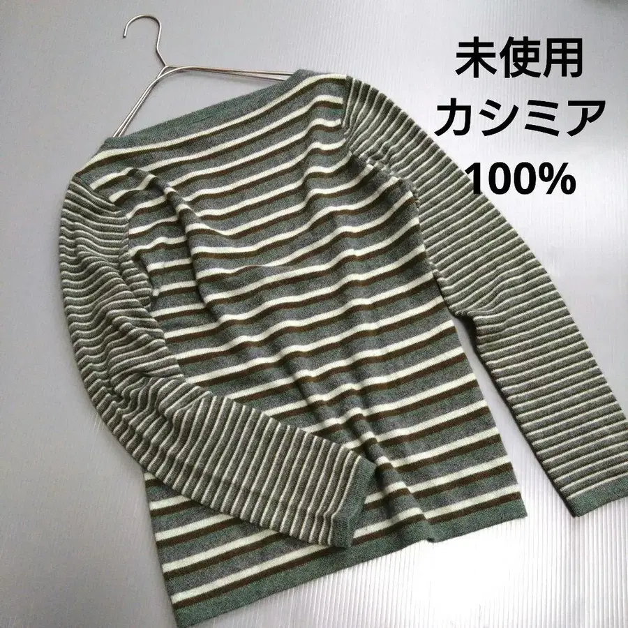 미사용 캐시미어 100% 니트 스웨터 카키 보더 그린