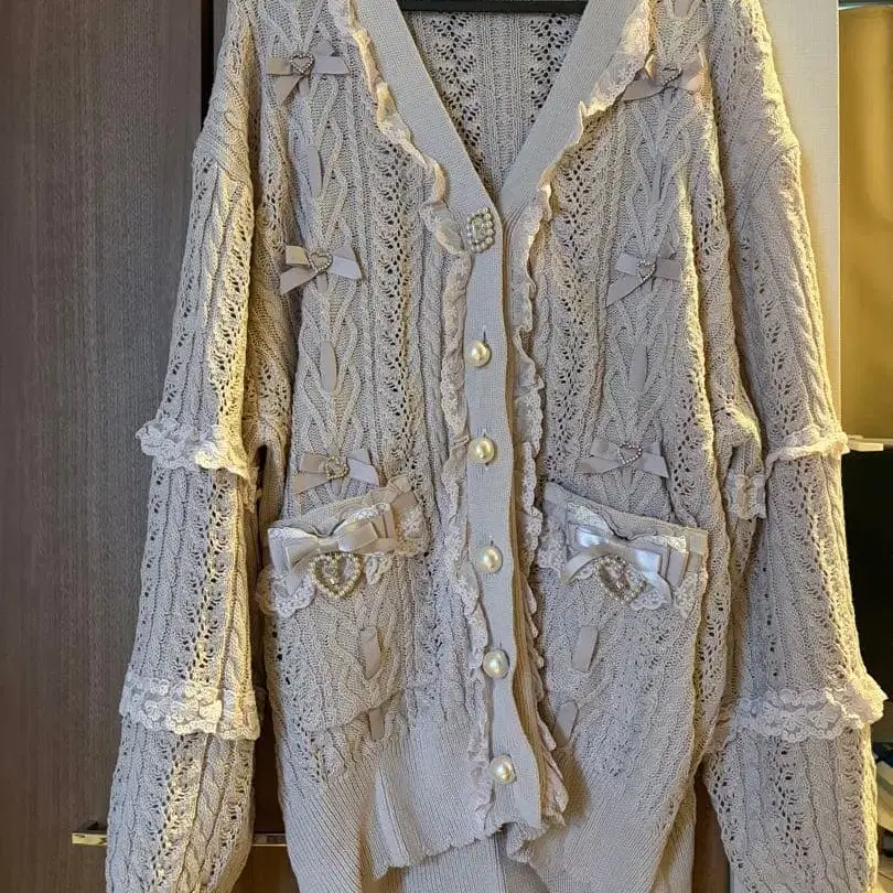 LIZLISA 리본 레이스 시스루 가디건 롱 핑크