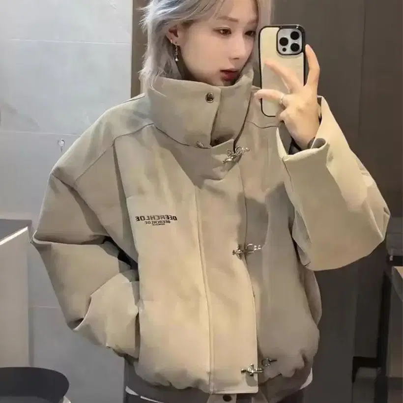 베이지 다운 자켓 높은 옷깃