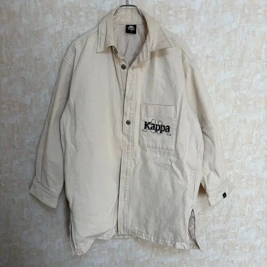 베이지 색상의 Kappa 자켓, 포켓 부착 및 자수 로고가 특징입니다.