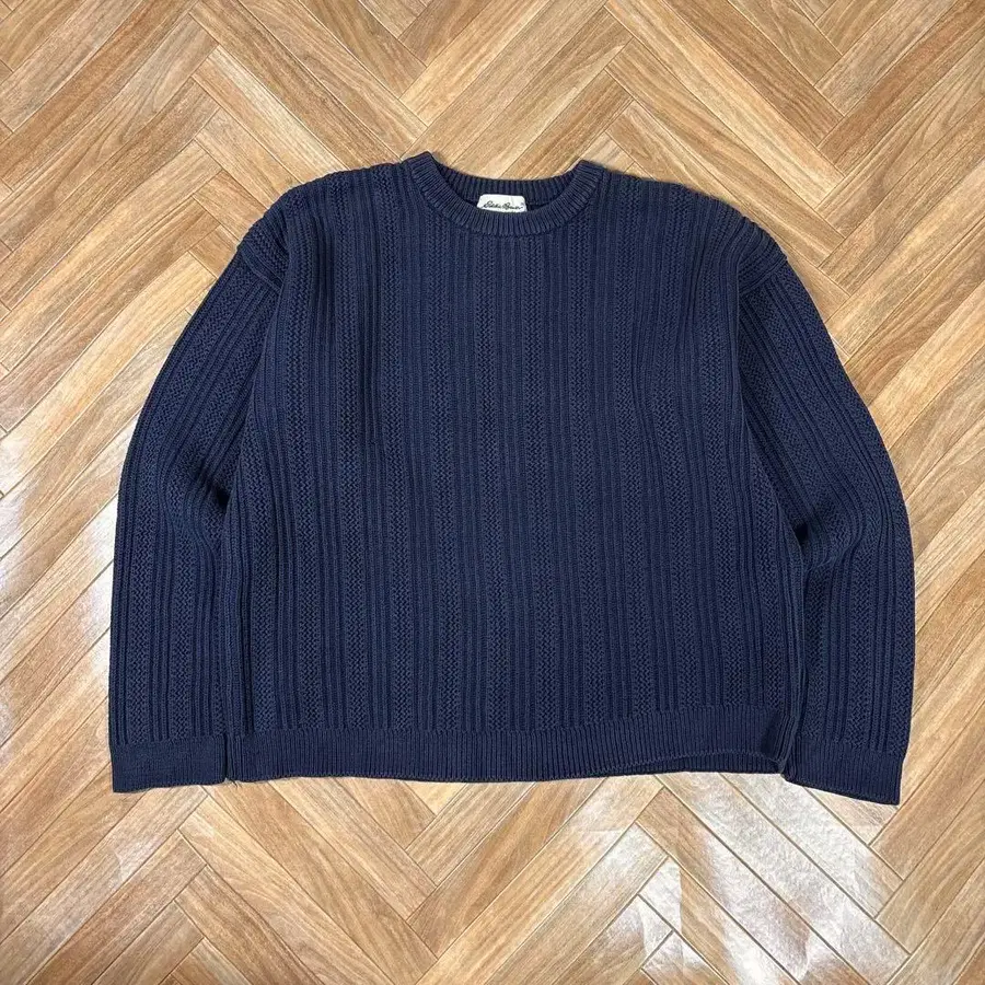 90s 화이트 택 에디 바우어 쇼트 크루넥 코튼 니트 네이비 컬러 리브
