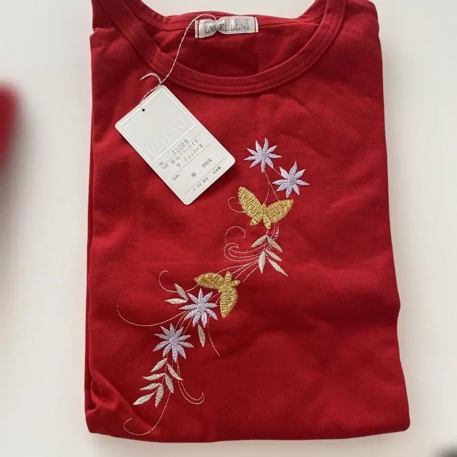 빨간색 긴팔 T셔츠 나비와 꽃 자수