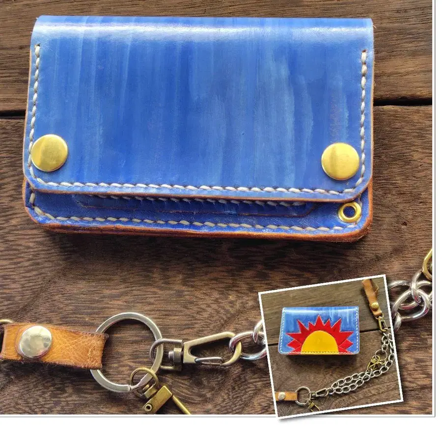 KTW-Z14 (2) : 지폐를 접지 않고 넣기 쉬운 버전: 이미지 6 참조 : 체인은 이미지입니다. 지갑만 판매합니다: 이 모델은 약 140 x 95 엉덩이 주머니에 쏙 들어가는 사이즈 가죽 두께 외장 2mm 내부 1.5mm 카빙 시리즈 뒷면에 수평에서 떠오르는 태양(라이징 선)을 그렸습니다. 이 태양처럼 계속 올라가세요. 큰 포켓 x 1 작은 포켓 x 1 지퍼식 동전 지갑 x 1 앞면 카드 홀더 x 1의 심플한 2층 (+ 바닥) 타입입니다. 지퍼는 안심할 수 있는 YKK제. 동전 지갑에 바닥이 있어 동전도 꺼내기 쉽습니다. 지폐는 접어서 넣지만, 접지 않고 지폐를 넣는 것도 가능합니다. 모두 손바느질이라 미싱에 비해 수고는 들지만, 강도가 뛰어납니다. 앞면 카드 홀더에 IC 계열 카드나 자주 사용하는 카드. 작은 포켓에 평소 휴대하는 카드를 넣으면 편리합니다. 가죽이라 처음에는 빡빡하지만 작은 포켓에 카드 5장 이상 들어갑니다. (너무 많이 넣는 것은 주의) 가죽 특유의 흠집이나 얼룩, 제작 중에 생긴 마킹 흔적이나 미세한 흠집 등이 있을 수 있습니다. 이해해 주십시오. #언덕염색 #바이커 #태양 #차심 #미니 #미들 #숏 #트래커월렛