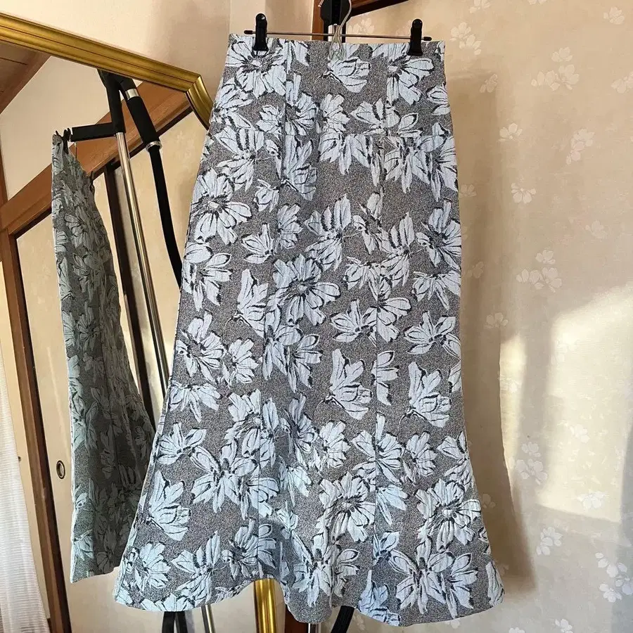 플레어 스커트 그레이 파랑 꽃무늬