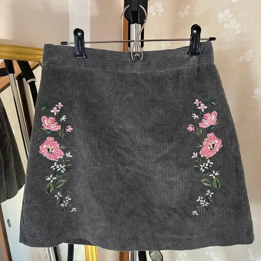 그레이 코듀로이 타이트 스커트 꽃무늬 자수
