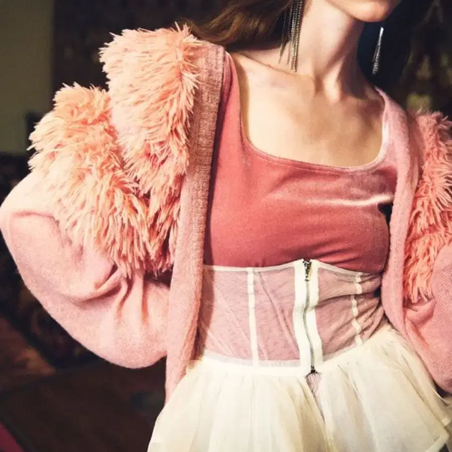 라벨에튀드 퍼 숄더 시스루 니트 숏 가디건