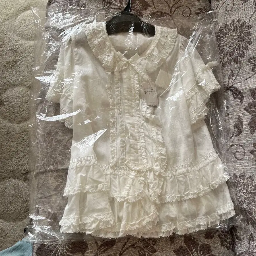 핑크하우스 프릴 장식 화이트 반팔 블라우스
