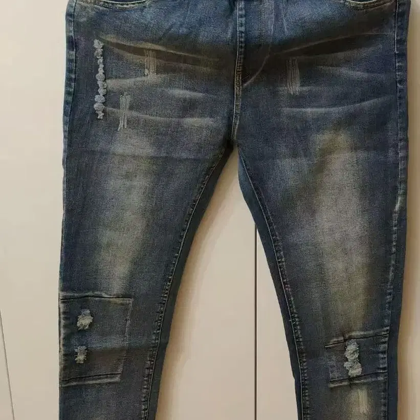 데미지 가공 다크 블루 슬림 핏 데님 팬츠