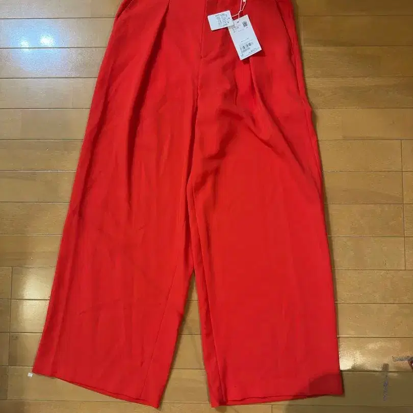 자동 번역되었어요. 원문보기폴리에스테르 소재의 빨간색 와이드 팬츠, 백 포켓 부착으로 스타일리시.