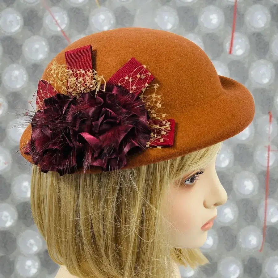 울 소재의 오렌지 컬러 보울러 햇, 꽃 장식과 리본 포함.