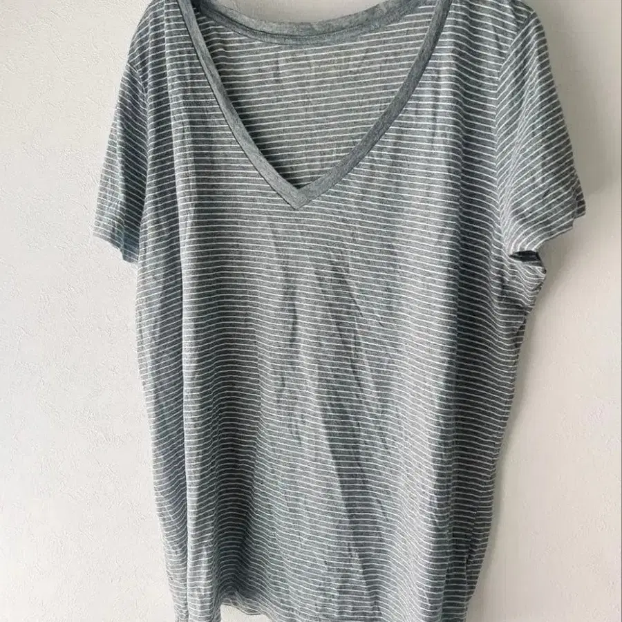 자동 번역되었어요. 원문보기부드러운 원단의 그레이와 화이트 스트라이프 V넥 티셔츠.