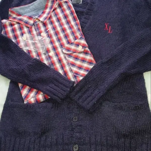 네이비 니트 가디건 & 체크 셔츠