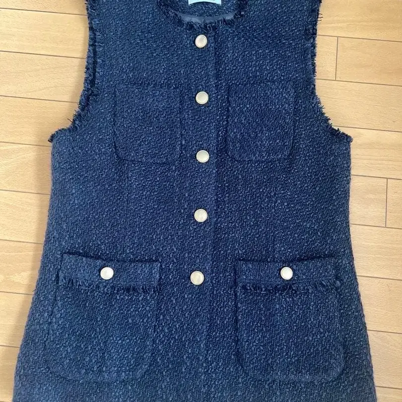자동 번역되었어요. 원문보기네이비 트위드풍 슬리브리스 베스트, 버튼과 포켓이 있습니다.