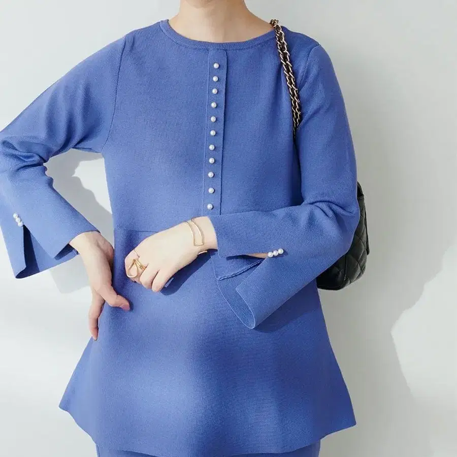 프론트의 펄과 페플럼 절개가 포인트인 깔끔한 니트.