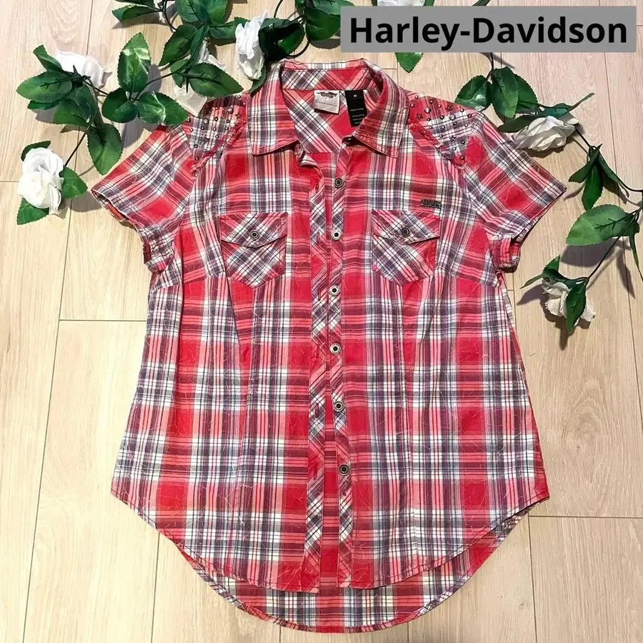 할리 데이비슨 반팔 체크 셔츠 레드 M 사이즈