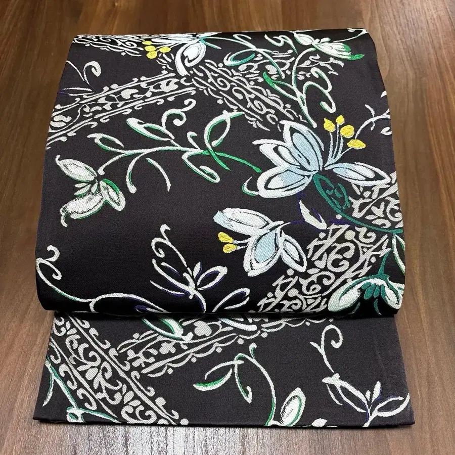 순수 실크 육통 후쿠로 오비 [ 꽃+덩굴 패턴 라인 ]