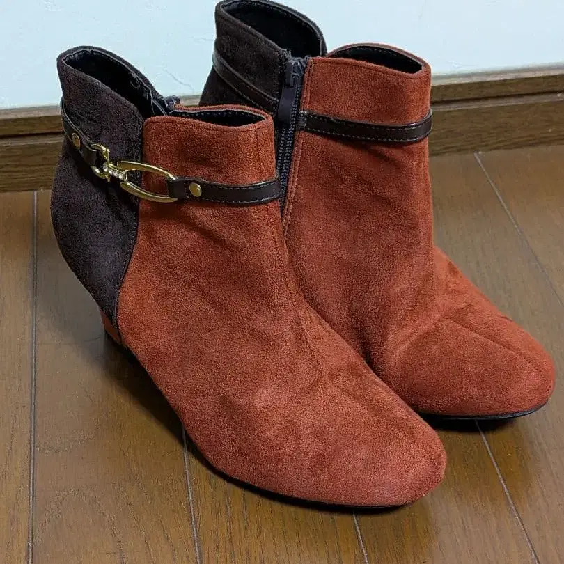 앙페티트의 스웨이드 소재, 벽돌색과 다크 브라운 색상의 앵클부츠입니다.