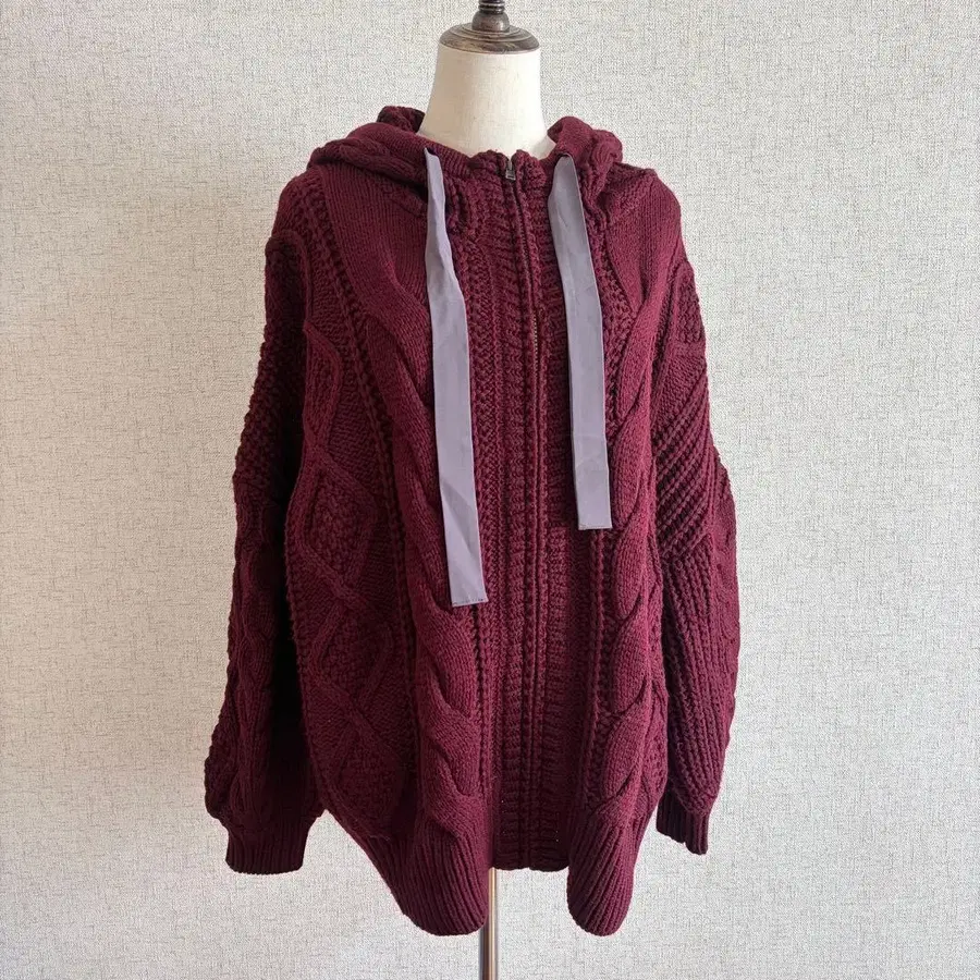 n OrLABEL/버건디 케이블 니트 후드 부착 가디건