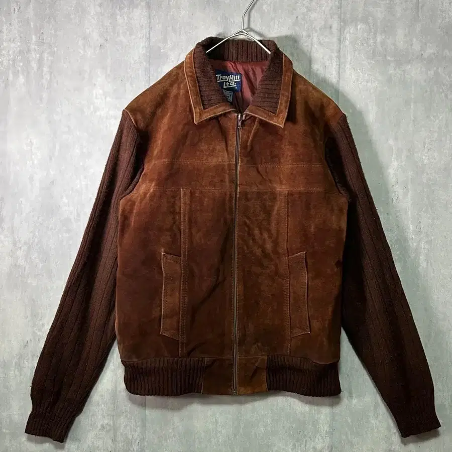 빈티지 가죽 니트 절개 블루종 브라운 천연 가죽