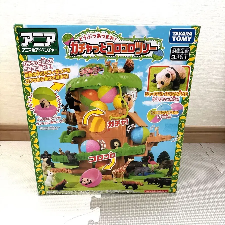 동물 어린이 아니아를 태운 캡슐을 사용하여 놀 수 있는 트리 형태의 플레이 세트입니다.
