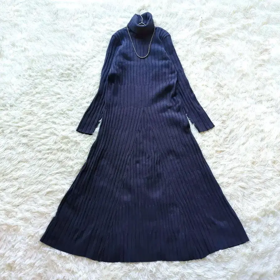 NOBLE 터틀넥 리브 니트 플레어 원피스 롱 기장 네이비 (세탁 가능)