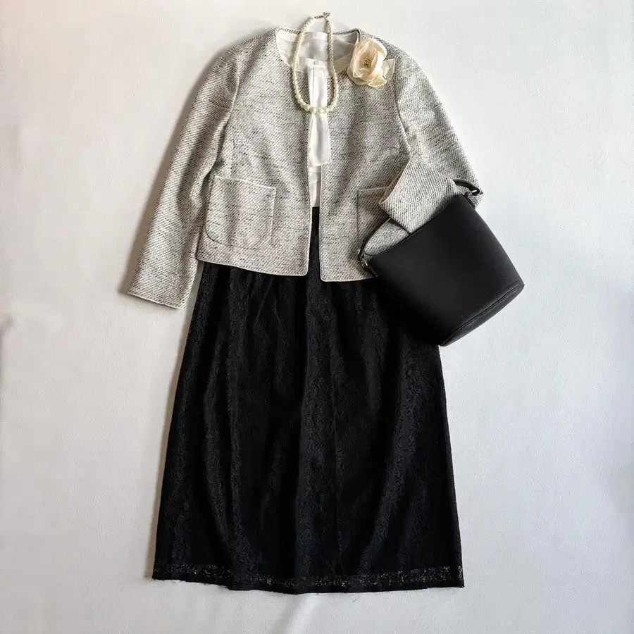 트위드 노카라 자켓과 스커트 셋업입니다. 스커트는 전체 레이스이며, 무릎을 덮는 안정감 있는 종아리 기장입니다. 졸업식이나 입학식 등 세레모니에도 고급스럽게 착용하실 수 있습니다. *액세서리, 블라우스 등은 부속되지 않습니다. ▫️ 브랜드 뷰티 앤 유스 ▫️ 색상 라이트 그레이, 블랙 ▫️ 안감 있음 ▫️ 사이즈 ⚫︎ 자켓 M 어깨 너비 36, 가슴 너비 44, 소매 길이 54, 기장 50 ⚫︎ 스커트 M 허리 평평하게 놓음 32, 힙 평평하게 놓음 56 스커트 길이 75 ▫️ 상태 사용감이 적고, 눈에 띄는 데미지는 없습니다. *개인의 자택 보관 중고품입니다. 매장처럼 완벽한 상태를 원하시는 분, 예민하신 분은 구매를 삼가해 주시기 바랍니다. #so_n의 포멀 상품 보기 입학식, 졸업식, 입학식, 졸업식 세레모니 수트, 포멀 슈트, 엄마 여성 수트 시치고산