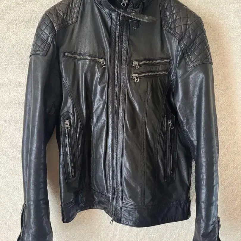 EDGE RUPERT의 블랙 가죽 라이더 자켓, 여러 개의 지퍼 포켓 부착.