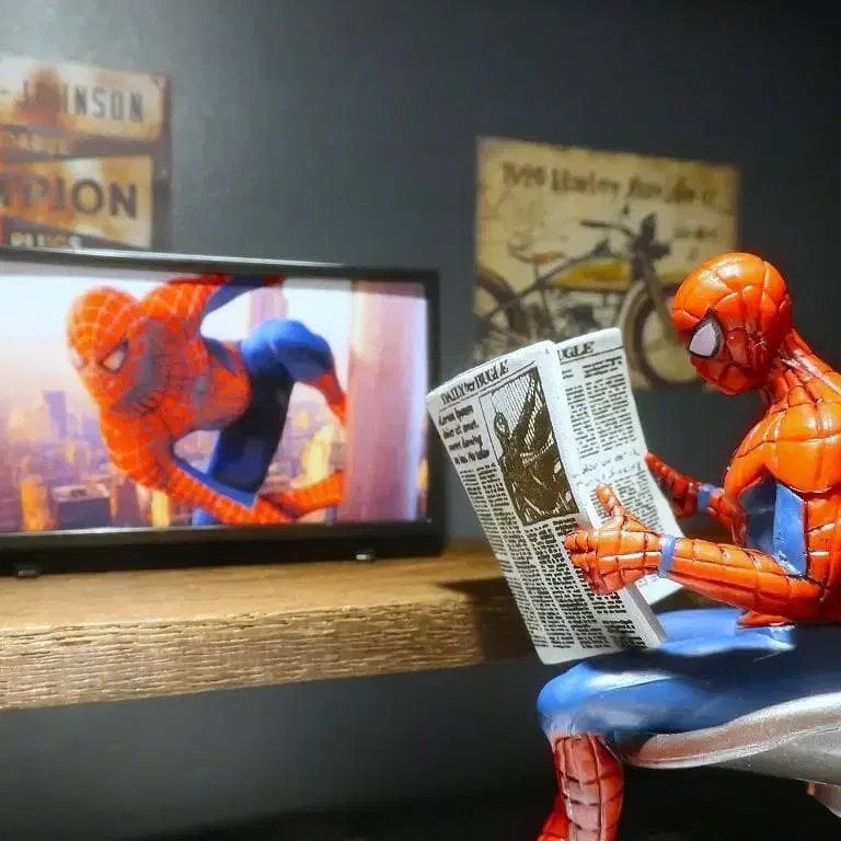 TV를 보면서 자신이 실린 신문을 읽는 스파이더맨 피규어