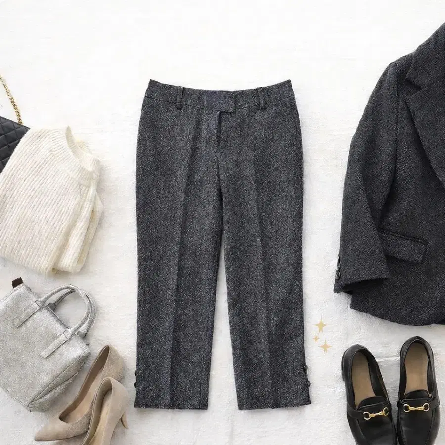 자동 번역되었어요. 원문보기짙은 그레이 계열의 섬세한 직조 패턴에 은은한 라메가 뿌려진 고급스러운 크롭 팬츠입니다.